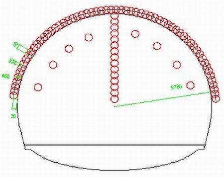 水平旋噴樁布置在隧道斷面180度范圍內(nèi),單樁長度20米,樁徑600mm,樁間距為400mm,相鄰樁相互咬合200mm,每循環(huán)搭接5 m。施工采用新開發(fā)的水平旋噴臺車及雙膠管通道旋噴鉆具,一個往復行程成樁20米,無需進行鉆桿拆卸,大大提高了施工工效。左右線兩部臺車四臺鉆機交替作業(yè)有效的保證了張承高速控制性工程的施工進度。